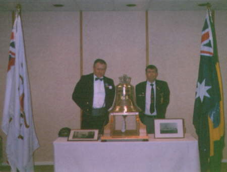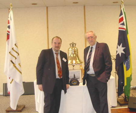 Chief Petty Officer David (Darby) Allan (left) and Ron Davis Jnr. with the ship's bell and standards.