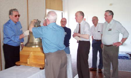 Cleaning the bell in preparation for the reunion. (l to r) James Watling (Chairman), Derek 'Lew' Lewis (Secretary), Sam Harris (Writer), Ken Simon (Supply), Keith Lawrence (Radar) and Trevor Cousins (Radar).