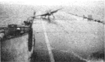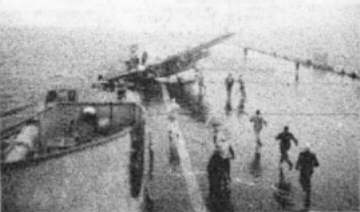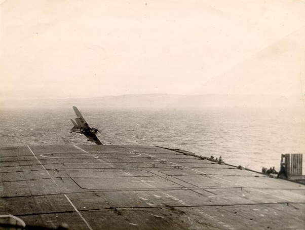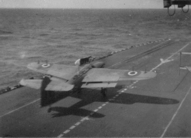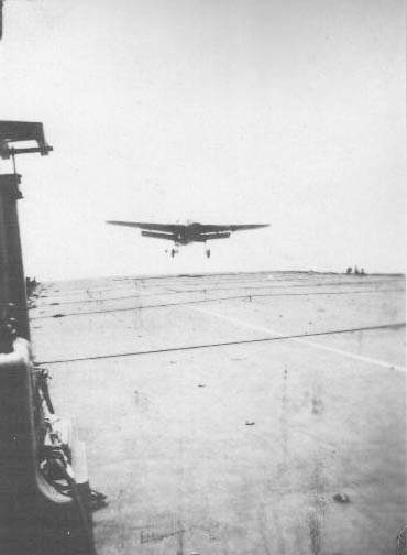 Final letdown on the 'straight-a-way', speed 65-70 knots, Barracuda ready for landing on, HMS. Vengeance.