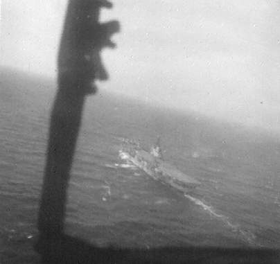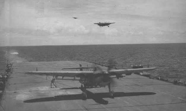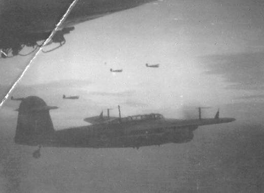 HMS. Vengeance from the air, Barracuda turning in for the approach, March 1945.
