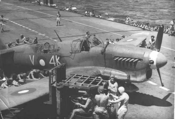 Fairey Firefly FR.1, V4K (MB 535) being lifted on flight deck of HMS. Vengeance.