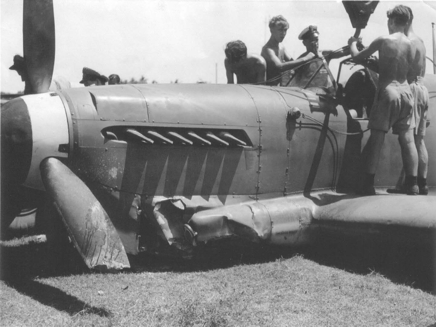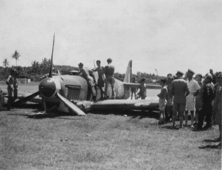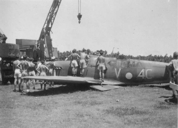 The result of an engine that lost power and pitch control packed up, prop. feathered at 200ft. a mile from the airfield at RNAS. Katukurunda, Ceylon on the 20th May 1946. S/L. 'Mush' Taylor.
