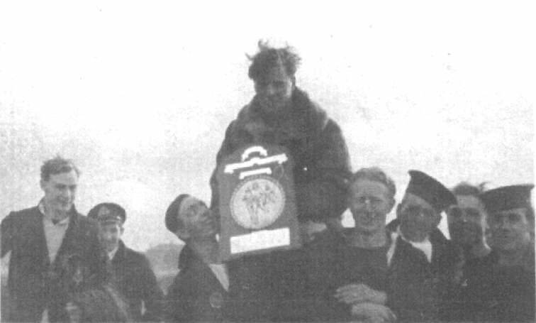 Sports Trophy at Crail, between June and September 1944. (l to r) C.O. Coxon, S/L. Dickson, P.O. Ron 'Pip' Piper, P.O. Geoff Squire (with Trophy) and four TAG's unknown.