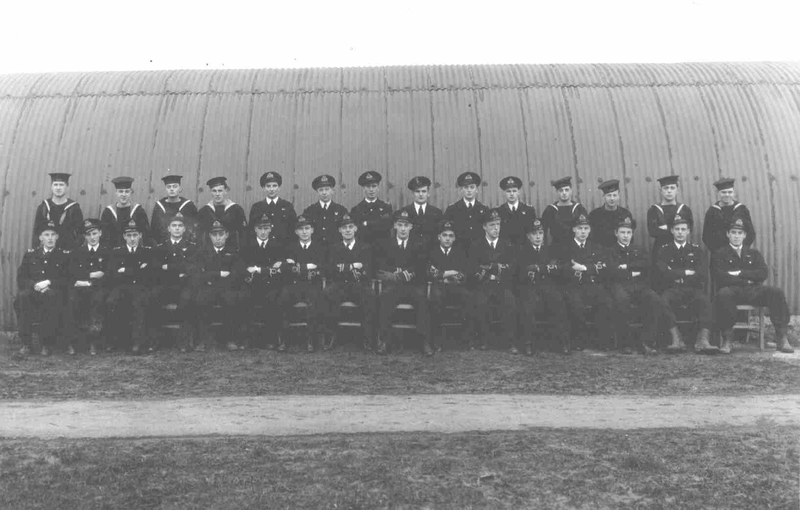 812 Squadron at RNAS. Fearn in November 1944. Back row (l to r): Tom Casey (TAG), Arthur Hennessey (TAG), Fred Rouse (TAG), Hubert Balsam (TAG), Ken Hutchinson (TAG), Geoff Squire (TAG), Stan Pomfret (TAG), Gordon Hughes TAG), ?. Thompson (TAG), Tom Stone (TAG), ?. McMahon (TAG), Harry Gee (TAG), Gordon Wynn (TAG), Bert Churchill (TAG). Middle row (l to r): P.O. ?. 'Slip' Slater (P), Peter Throssel (P), Sam Smallwood (P), John Birch (P), G. 'Happy' Pain (P), Gordon 'Blood' Wallace (O), Tommy Dewsnap (O), 'Spike' Regan (Sen.O), Robert 'Toby' Tobias (O), Derrick 'Bambi' Brook (O), Peter Stansfield (O), ?. Bentley, ?. Fisher, ?. 'Shiner' Wright, Bill Broad (O), Bob Roseveare (O), Miles Crosthwaite (O), Ian Trethowen (O), Robins (O), Joe Spencer (O). Front row (l to r): P.O. Sidney Hunt (P), John Dickson (P), Arthur 'Wigs' Muncer (P), Charles Wintringham (P), Peter Poole (Sen. P), C.O. Cedric Coxon (P), ?. 'Poppa' Bristow (P), ?. 'Jock' Balfour (P), John Cookson (P), Robbie Burns (P), ?. Digby (P).