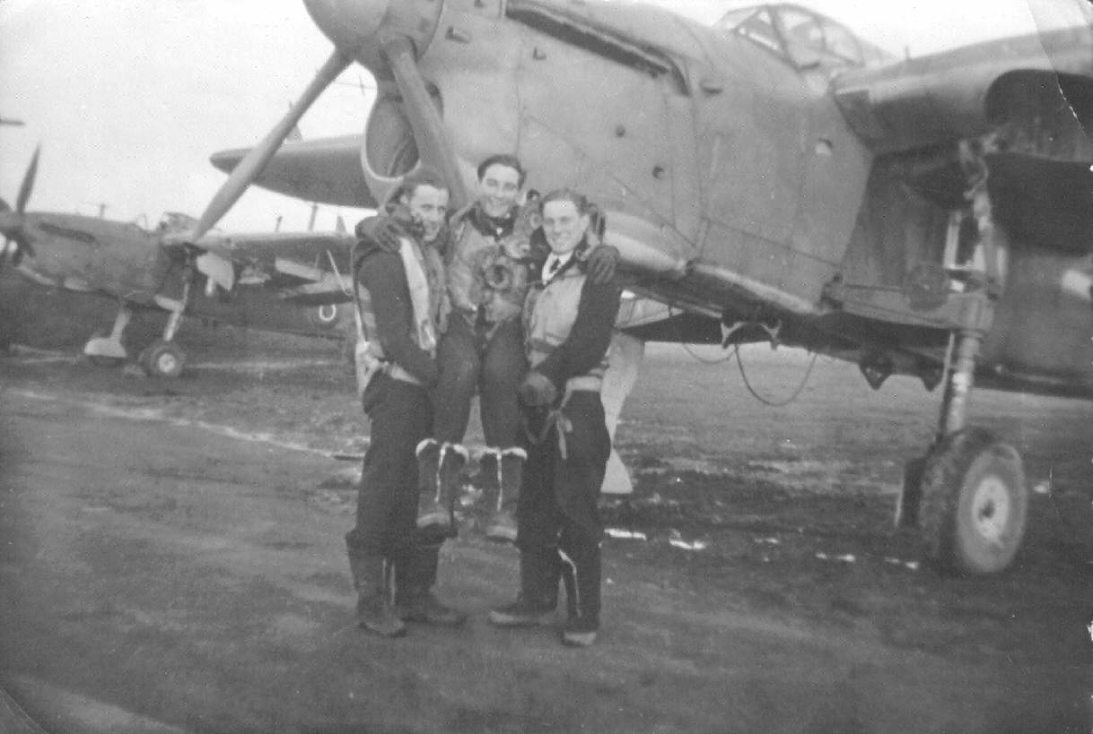 The crew of 'R' for Roger, Barracuda II (MD 695). (l to r): P.O. Geoff Squire (TAG), S/L. John Dickson (Pilot) and Derrick 'Bambi' Brook (Observer) at RNAS. Burscough in October 1944.