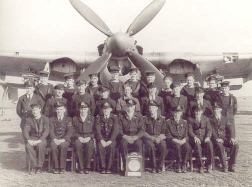 812 Squadron at RNAS. Burscough between September and October 1944. Back row (l to r): Arthur Hennessey (TAG), Fred Rouse (TAG), Gordon 'Timber' Wynn (TAG), Geoff Squire (TAG), John Dickson (P), Miles Crosthwaite (O), ?. Hill (O), P.O. Tom Casey (TAG), Joe Spencer (O), David Robins (O), Vic Hamill (TAG), ?. McMahon (TAG), Gordon Hughes (TAG), Bert Churchill (TAG). Front row (l to r): Harry Saggs (O), Derrick 'Bambi' Brook (O), ?. Fisher (O), Bill Broad (O), Jock Balfour (P), Tommy Dewsnap (O), Gordon 'Blood' Wallace (O), 'Spike' Regan (Sen. Observer), Lt. Cdr. Cedric Coxon (C.O.), Peter Poole (Sen. Pilot), 'Poppa' Bristow (P), Les Terry (P), ?. Stansfield (O), John Cookson (P), ?. Digby (P), Peter 'Ace' Throssel (P).