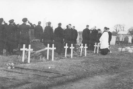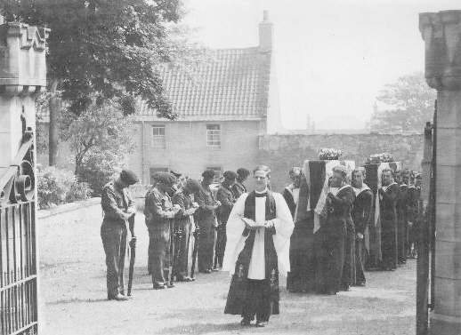 The bodies of P.O. Stephen Blakey and TAG Eric Sargent are carried into the Church Yard at Crail Cemetery, Fifeshire, Scotland, in July 1944.