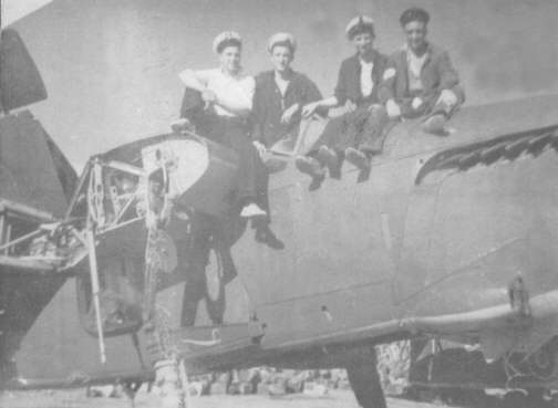 Maintenance team for 812 Sqdn. Barracuda's. (L to R) P.O. Roy Riddington, Harry Orton (Engines), 'Cockney' (Electrics) and 'Dusty' Miller (Airframes). Photo taken at RNAS. Halfar, Malta in March 1945.