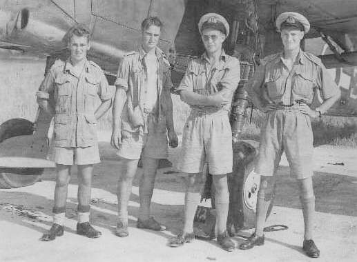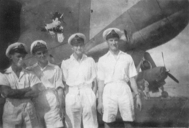 Barracuda 374/A (PM 949) with crew at Kai-Tak Airfield in November 1945. (Left to right) George Downie (Jock), Charlie Morgan (A/Mech.), Johnny Cookson (P) and F. 'Shiner' Wright (O).