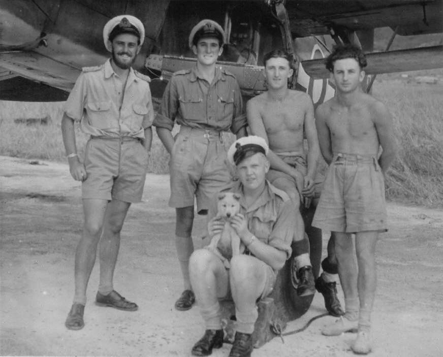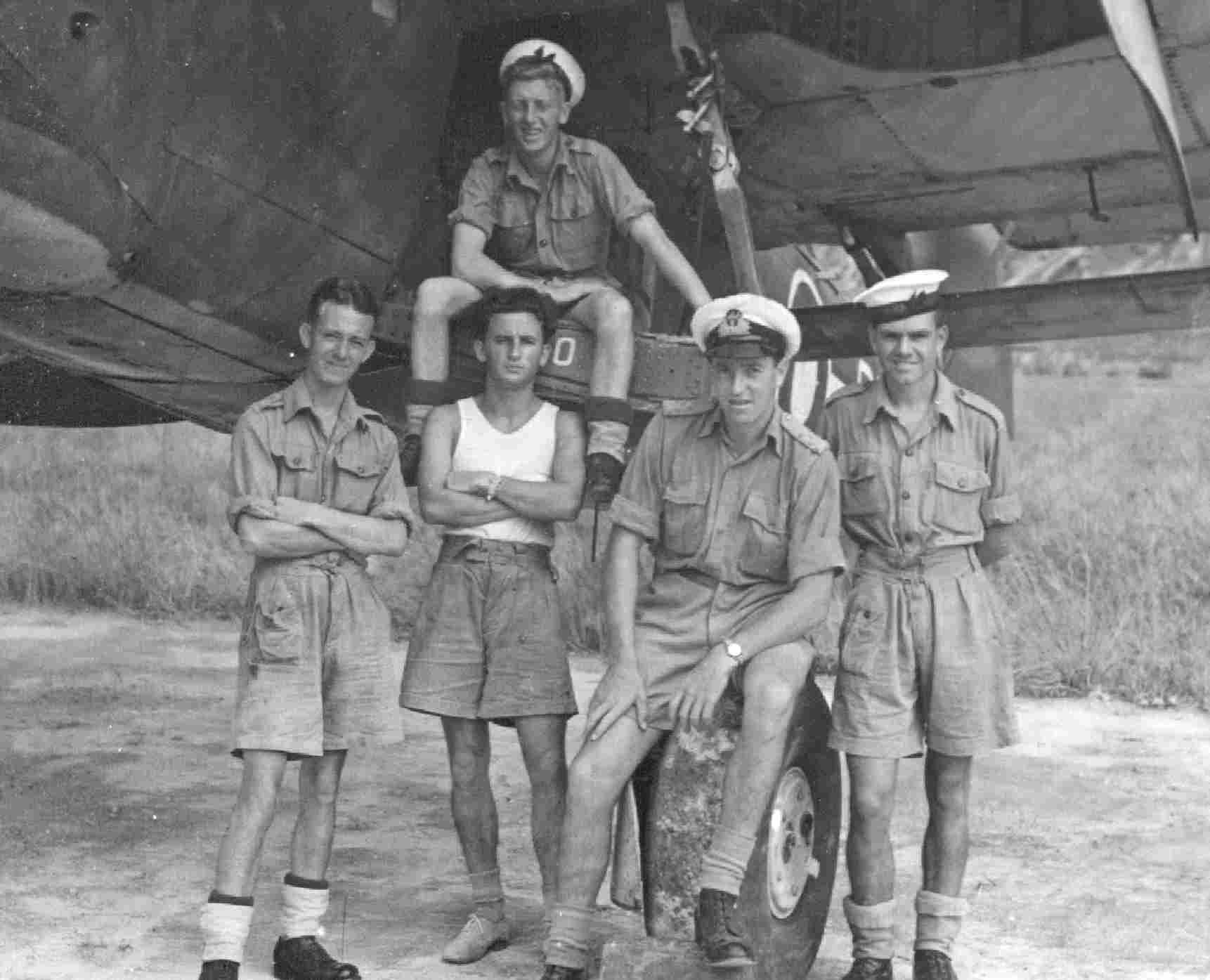Barracuda 380/A (MX 653) with crew at Kai-Tak in 1945. (seated) F. Wilkins (Fitter). (left to right) E. Prosser (Rigger), Trevor Murphy (Electrician), S/L. D. 'Stormy' Fairweather (Pilot) and Burt Churchill (TAG).