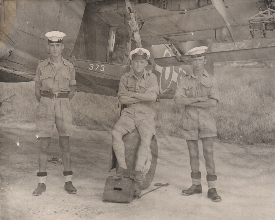 Barracuda 373/A with crew at Kai-Tak Airfield in 1945. (Left to right) Unknown, S/L. Robbie Burns (P) and Matthew Tighe (A/Mech. A).