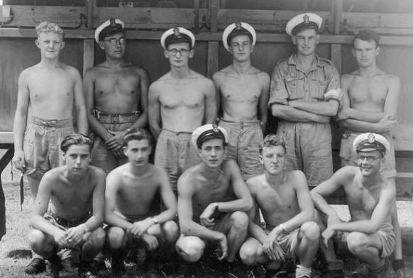 Petty Officer's of 812 Squadron at HMS. Ukussa, RNAS. Katukurunda, Ceylon, in 1946. Back Row (l to r) Gordon Theaker, George King, 'Taff' Davies, Allan Morris, ?. Edwards, Dave Mainwaring. Front Row (l to r) Ernie Ross, ?. Birch, 'Curly' Banks, Charles 'Jock' Davidson, Dick Mauger.