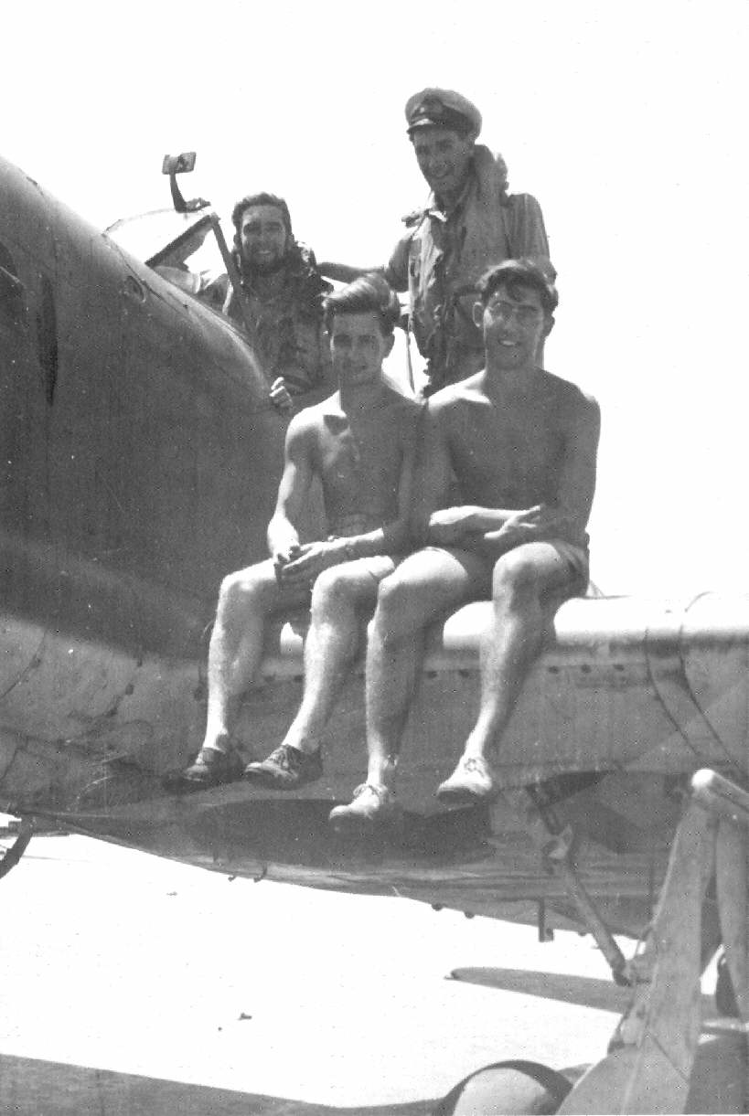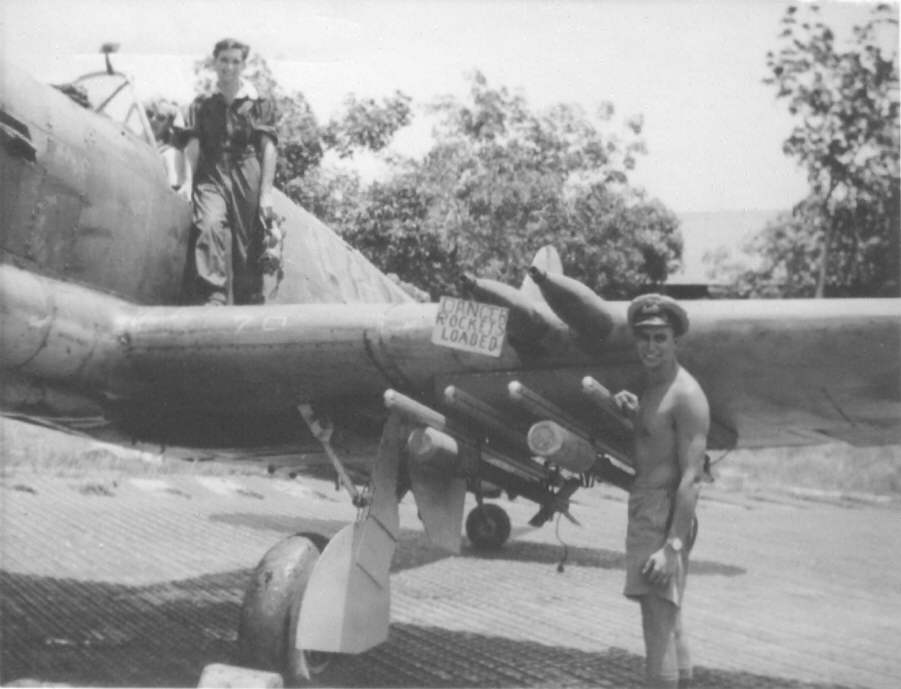 Firefly FR.1, V4K (MB 535) on HMS. Vengeance in the Red Sea in July 1946. S/L. J. 'Dickie' Dickson (P) in cockpit, S/L. S. 'Sid' Johnson (O) standing on wing, with Rigger Ken Gillingham and Fitter Milnes sitting on wing.