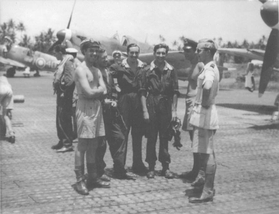 Squadron dispersal at HMS. Ukussa, RNAS. Katukurunda, Ceylon in May 1946. (left to right): Chief Cottle, 'Mush' Taylor, 'Stormy' Fairweather, John Dickson, Reg Parton and Johnny Cookson.