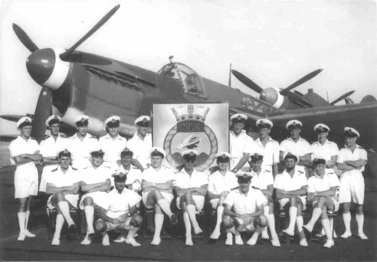 812 Squadron aircrew aboard HMS. Vengeance en-route from Malta to Gibraltar on 4th August 1946. Back row: (l to r) D. James (P), D. Harris (P), ?. Spanton (?), ?. Steel (?), ?. Hunt (?), G. 'Tom' Stride (P), H. Hawkesworth (P), P. Pritchett (O), ?. 'Barney' Barron (P) and ?. Hodgson (?). Sitting: (l to r) S. 'Sid' Johnson (O), R. 'Rob' Roseveare (O), D. Rice (O), ?. Cooper (?), Lt. Cdr. R. 'Ropey' Wynne-Roberts (C.O.)(P), ?. 'Pinky' Windle (P), R. Parton (P), J. Dickson (P) and D. Fairweather (P). Squatting: (l to r) J. Butterworth (P) and L. Robinson (P).