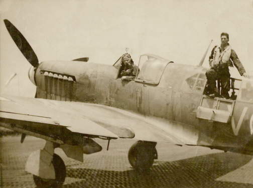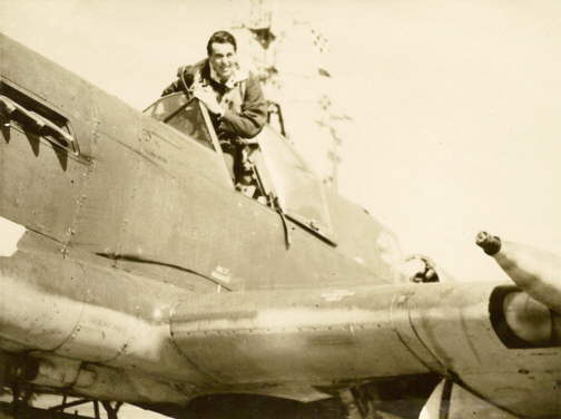 Sub. Lt. Leslie Robinson (P) aboard HMS. Vengeance in a Firefly FR1. The Mast of HMS. Vengeance is in the background.