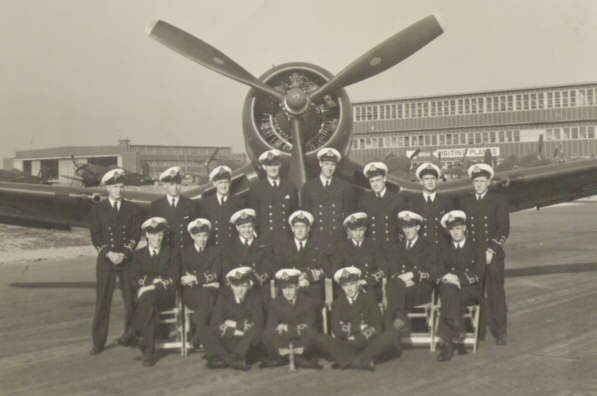 The Squadron consisted of, Commanding Officer Lt. Cdr. Patrick Chilton R.N., Senior Pilot Lt. Grogan R.C.N.V.R. and pilot's, S/L. Bardner, S/L. Borthwick, S/L. Bouchard, S/L. English, S/L. George, S/L. Gurnhill, S/L. Laine, S/L. Lynch, S/L. McKinstry, S/L. Rickell and S/L. Rouse. All but two of the pilot's, passed through H.M.S. St. Vincent at Gosport, Hampshire and progressed together through the various stages of Flight Training in the United States. S/L. Rouse wrote a Squadron ditty and played the guitar and S/L. Bardner was an accomplished classical pianist. All except the Commanding Officer and Senior Pilot, were trained in the United States and earned their 'wings' at Pensacola, Florida in late 1943.
