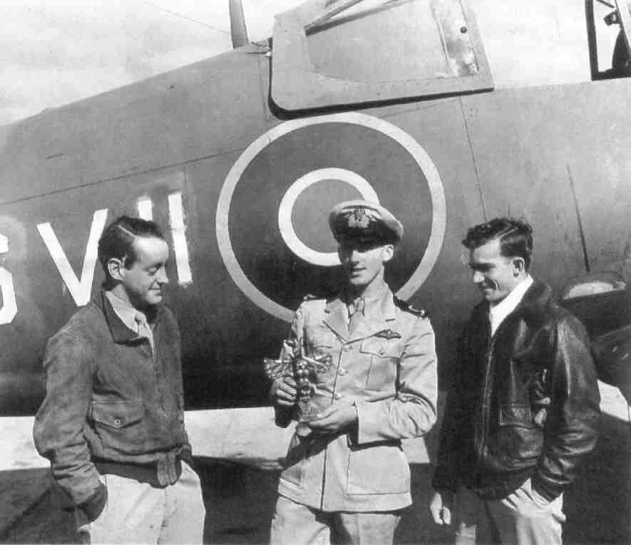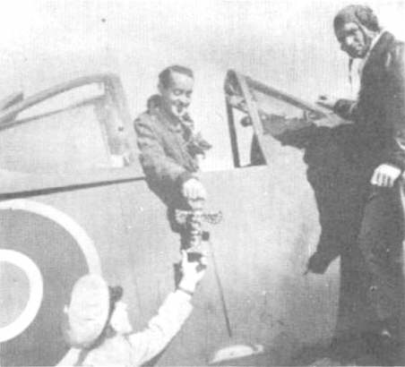 S/L. Stanley Borthwick (left) hands the Totem to C.O. Pat Chilton in the Corsair cockpit. S/L. Norman McKinstry standing (right).