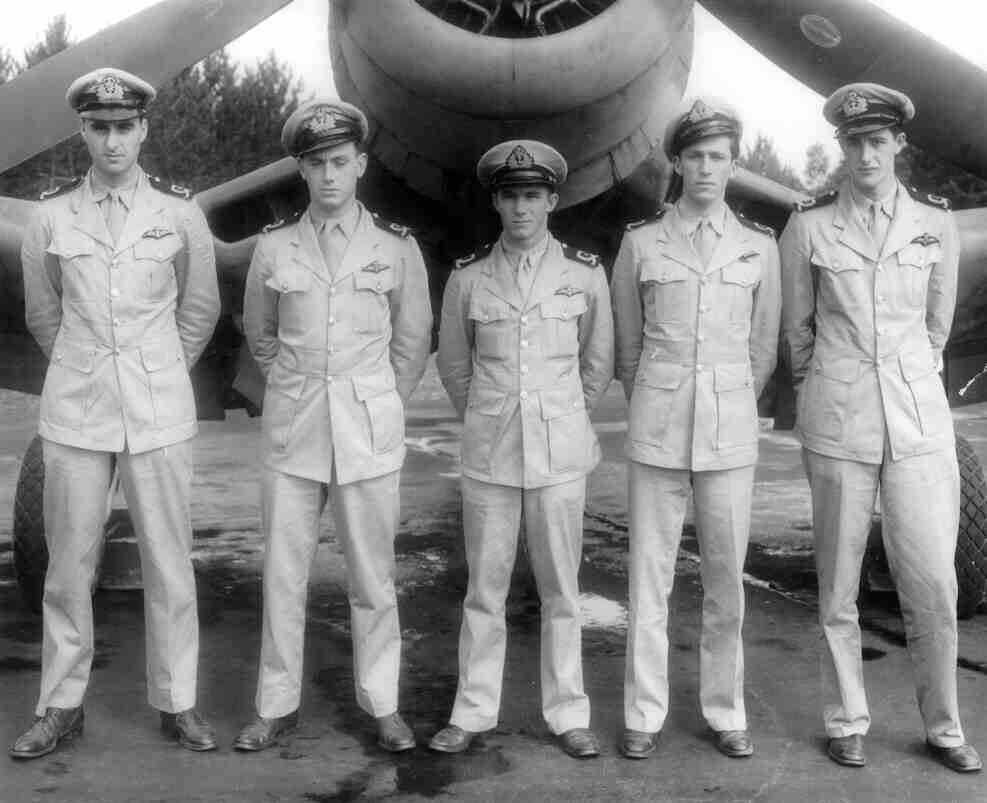 No.738 Training Sqdn. at Lewiston-Auburn airport (RN air facility) Maine, USA in July 1944. A holding area for Corsair pilots from Jacksonville, Florida. (left to right) S/L. P. Cann, S/L. F. English, S/L. N. McKinstry, S/L. L. MacLean and S/L. H. Bouchard.