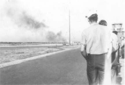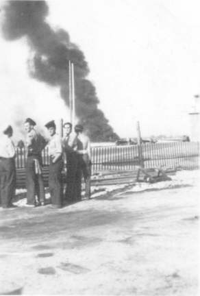 Smoke rises from crashed aircraft near NAS. Brunswick on Monday 11th September 1944. S/L. H. Bouchard (13V11 - JS612) and S/L. C. Gurnhill (8V11 - JS669) both killed. U.S. and R.N. ground crew look on.