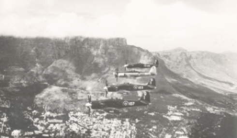 Sea Furies of 802 Sqdn. flying in formation over South Africa. Furthest aircraft Q/106, Q/109, Q/103 and Q/107 nearest.