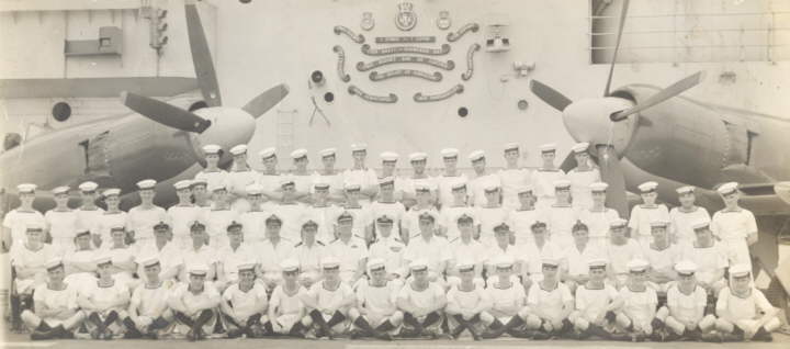 Back row (l to r): Gotobed, Berry, Peter Watt, Dyer, Chandler, Wetherstone, Cooper, Ferguson, Axe, Andrews, Read and Jerram. Third row (l to r): Knights, Crutchley, Knights, Keenan, Warrington, Jackson, Owen, Homes, Gilroy, Gilson, Anderson, Burrows, Hawkins, Wilson, Michael, Philips, Colins, Williams, Pople, Hinkley, Colins and Timins. Second row (l to r): Gerwin, Cook, Whitehead, PO. Triggs, PO Hunt, LFT. Rodwell, LFT. Richardson, Commander Sears, Captain Terry, LFT. Commander Bagley, PO. Saxon, PO. Gordon, LAM. Self, PO. Stone, LAM. Illidge and LAM. McNab. Front row (l to r): Flory, Gest, Brown, Jones, Wardman,Moore, Sayce, Rickard, Gray, Hopkins, Ellis, Castleton, Coe, Jones and Holmes.