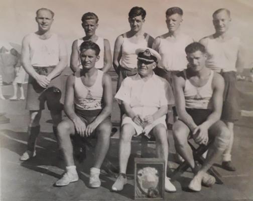 Royal Marine Deck Hockey Team, HMS. Vengeance in 1948. Marine Les Blakey (Standing 4th L to R). Captain J. T. Crombie (Seated 2nd L to R). Others unknown.