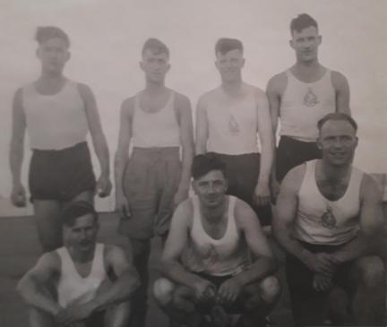 Royal Marine Les Blakey (3rd L to R) aboard HMS. Vengeance in 1947. Others unknown.