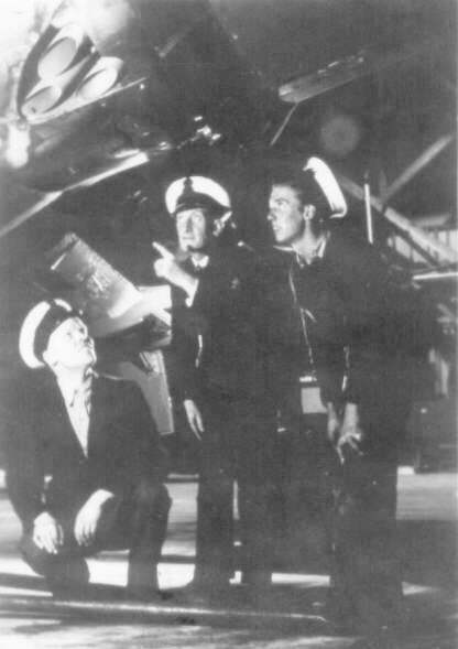 In the hangar at Brunswick, Maine in 1944. Sandy, Jack 'Dusty' and Len Harvard find an oil leak on a Corsair.