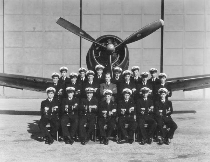 1850 Squadron pilots at USNAS. Brunswick, Maine, USA., in August 1944. Back row (l to r) Cliff Macey, Bevis Elliott, Bert Burman, Don Attenborough, Dick Payne and Dick Bloxam. Middle row (l to r) Peter Hudson, John Morris-Jones, George Cathcart, Mr. N.E. 'Robbie' Robinson (Goodyear Rep.), Tom Stacey, Peter Hodgson and Eddie Kiernan. Front row (l to r) Syd Courtis, John Burt, Lt. Bill Drews (US Navy Liason Officer), Mike Hordern (C.O.), Dick Phillips (Senior Pilot), Bill Blair and Tim Adkin.