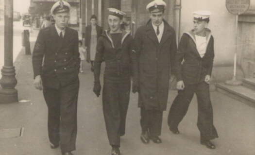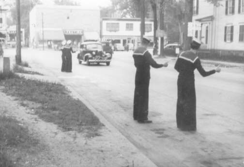 Royal Navy ratings 'thumbing it' from Brunswick to Portland, Maine, USA in 1944.