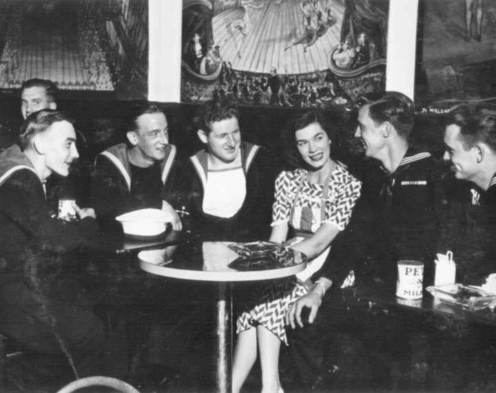 Royal Navy and American sailors mix socially in the 'Stage Door Canteen', New York in June 1944. Air Mechanic (E) Ken Reid 1850 Squadron third (l to r).