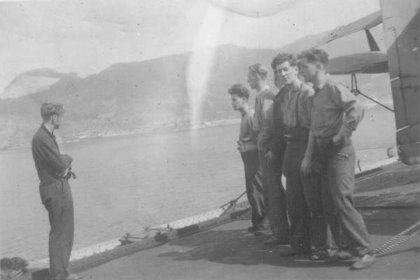 Off Gibraltar, en-route to Malta in 1945. 'Ginger' York of 1850 Sqdn. (2nd right. looking at camera) on flight deck. Barracuda of 812 Sqdn. to the right. Others unknown.