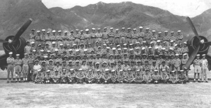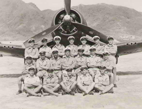 1850 Squadron Group photo at Kai-Tak Airfield (RNAS. Kai-Tak) in late December 1945. (Second row seated l to r) R. Flint (AEO), D. Attenborough, T. Adkin, H. Burman, T. Stacey, G. Cathcart, D. Rouse, R. Bloxam, G. Hay (Admin), W. Waller, M. Hordern, R. Phillips, P. George, S. Borthwick, A. Rickell, E. Kiernan, S. Courtis, J. Jones, P. Hodgson. E. Packer and R. Davis (front row seated, 8th & 10th left to right).