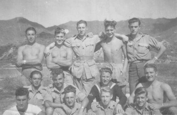 1850 Sqdn. air mechanics at Kai-Tak airfield in 1945. (back row l to r) D. Mann, Jim Parks, 'Loftie' Edwards, 'Geordie' Bains, 'Taff' Williamson. (middle row l to r) 'Logger' Wood, Stan Smith, Eric Rayner, Ken Reid. (front row l to r) W. 'Darkie' Dunbar, Bob. 'Monty' Banks, 'Ginger' Knight, Tommy Rainbow.