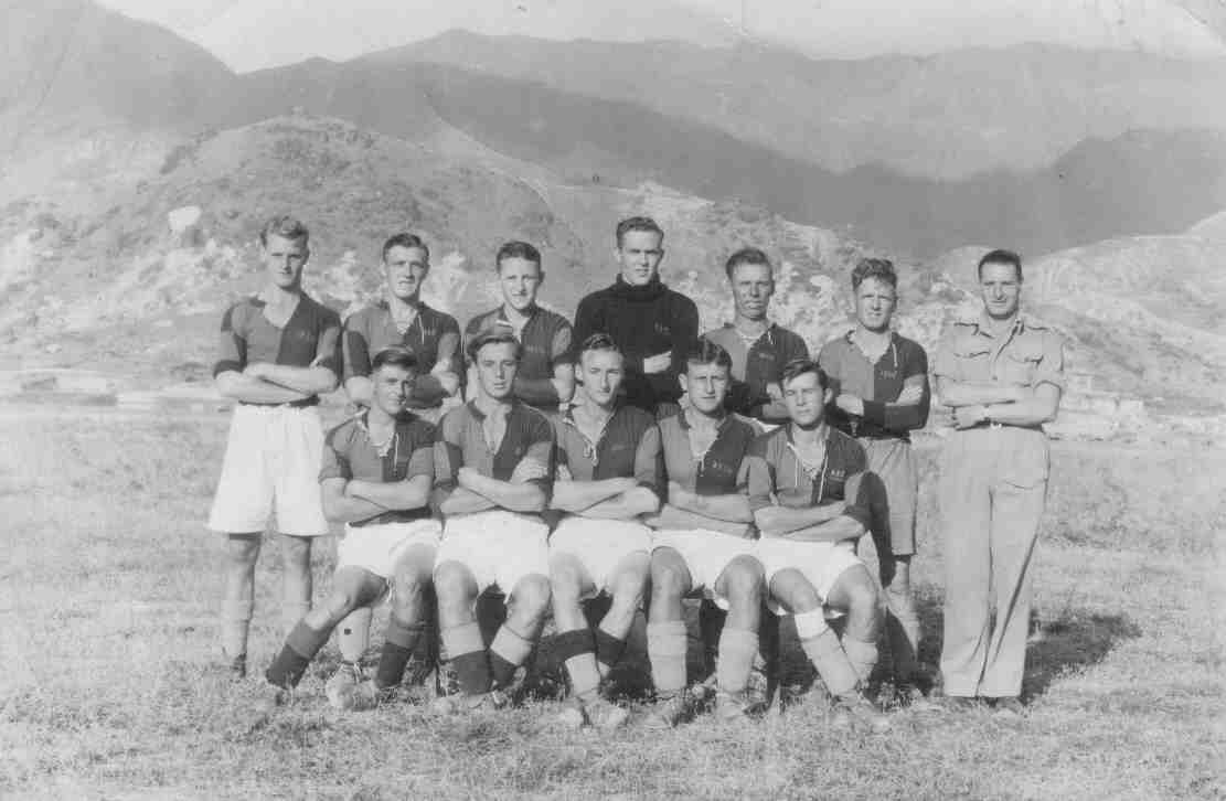 The 1850 Sqdn. Football team at Kai-Tak Airfield in 1945. Goalkeeper (centre, back row) Harold Searson who later played for Leeds United. Henry Shelton (6th l to r, back row) in uniform. Ken Whitaker (seated 5th l to r).