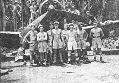 1850 Squadron personnel with Corsair at HMS. Ukussa, RNAS. Katukurunda, Ceylon between April and June 1946. 'Pop' Ellison right side of engine cowling, Maurice Satchell standing (4th l to r) other persons unknown.