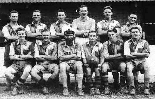The 1850 Squadron Football Team at HMS. Ukussa, RNAS. Katukurunda, Ceylon between April and June 1946. Back Row (Left to Right) ?, ?, ?, ?, ?, ?. Front Row (Left to Right) S/L. E. Kiernan, L. Pratt, Lt. Cdr. W. Waller, ?, ?, ?.