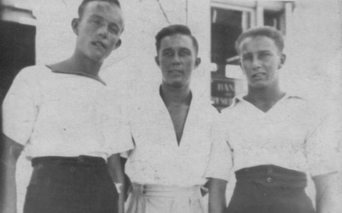 Taken, presumably in Australia, date not known. Possibly 'Geordie' Spoors*, E. Packer * or 'Yorkie'*?. Dad on right. (*Searching for)