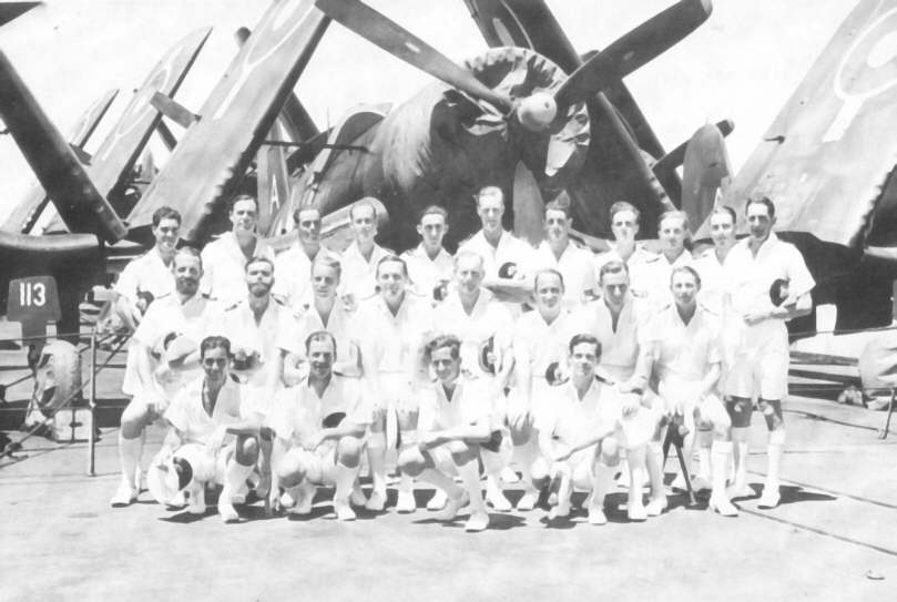 The aircrew of HMS. Vengeance 1946. Back Row (l to r) Geoff 'Stuffer' Hay (Staff Officer), ?, ?, ?, Eaton (AEO - 812 Sqdn.), ?, ?, ?, Ray Flint (AEO -1850), ?, ?. Middle Row (l to r) ?, Wilf Waller, Derek Empson, ?, ?, ?, ?, Dick Phillips. Front Row (l to r) ?, ?, Fred English, ?. Corsair '113/A' in background.