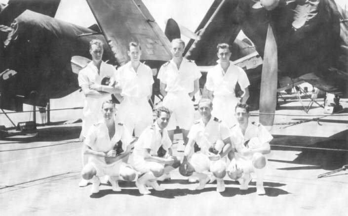 The aircrew of HMS. Vengeance 1946. Back Row (l to r) ?, ?, Derek Empson, ?. Front Row (l to r) ?, Fred English, Ray Flint, Burt Burnham.