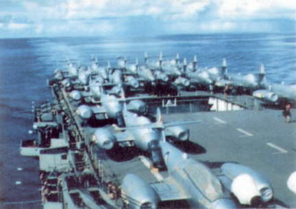 HMAS. Vengeance returning to Australia from Iwakuni, Japan with Meteor aircraft of RAAF 77 Squadron (Korea). The wings were detached outboard of the engines.