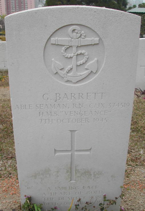 Son of Alfred and Annie Barrett of Selby, Yorkshire, England. Ships Company HMS. Vengeance. Cause of death Malaria. The Commonwealth War Graves Commission Casualty No. 2220765. War Grave photos below. (Enlarged)