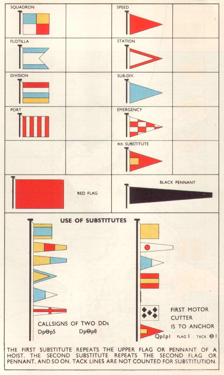 This combination of flags, together with their different meanings, is known as a 'signal code'. Two codes are in use by the Allied Navies, the Naval code (used by warships) and the International code (used by merchant ships and between warships and merchant ships).