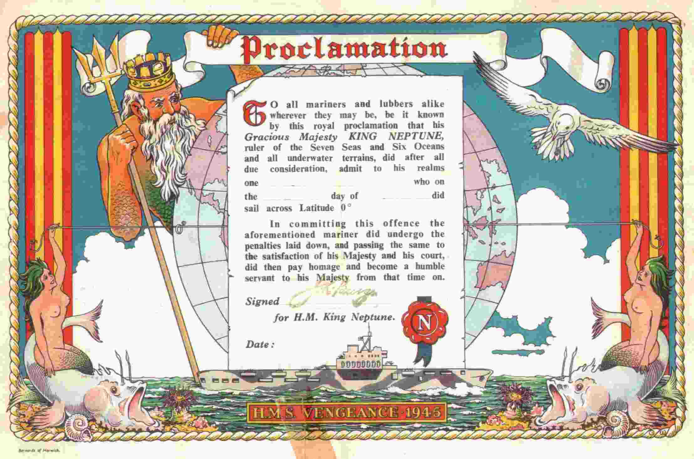 'Crossing the Line' Certificate from H.M.S. Vengeance, 1945.