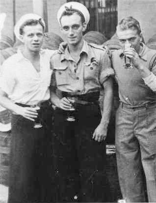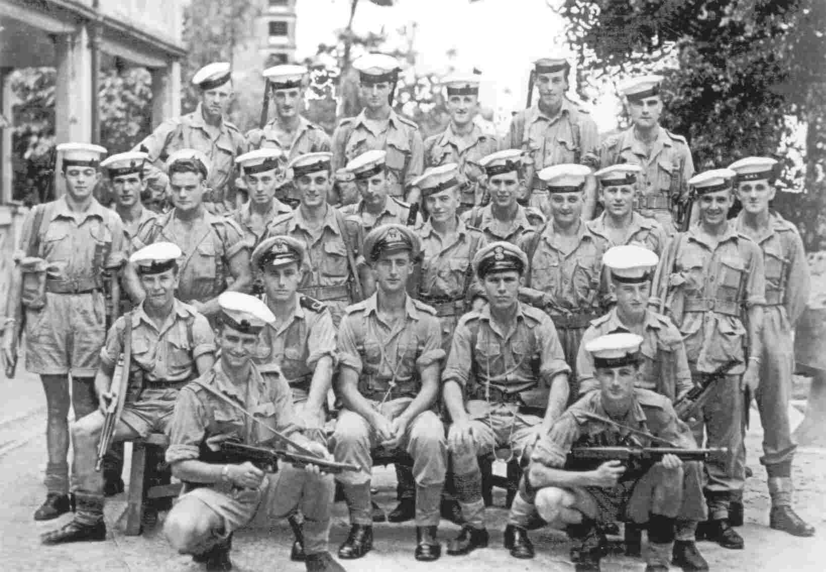 A mixture of No.1850 & No.812 Squadron personnel, taken at Victoria Barracks, Hong Kong in 1945. (Dad is in 1st row standing, 4th left to right, between Officer and Petty Officer). Back Row (l to r) ?, * Miller (812), C. Morgan (812), H. Orton (812), G. Wilkinson (1850), ?. 2nd Row Standing (l to r) ?, H. Smith (812), ?, ?, A. Fay (1850), ?. 1st Row Standing (l to r) ?, C. Broadbent (1850), E. Packer (1850), R. Davis (1850), H. Horton (812), ?. Sitting (l to r) E. Rayner (1850), S/L. ?, Lt. Boyle, P.O. Griffin (1850), E. Simonds (812). Front Squatting (l to r) * Charlton (1850), T. Murphy (812).