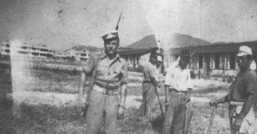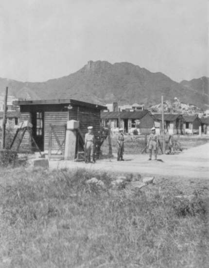 Main Gate of No.2 P.O.W. Camp, (Sham Shui Po) Kowloon, Hong Kong in 1945. Dad is 2nd. left to right. 'Lion Rock' in background.