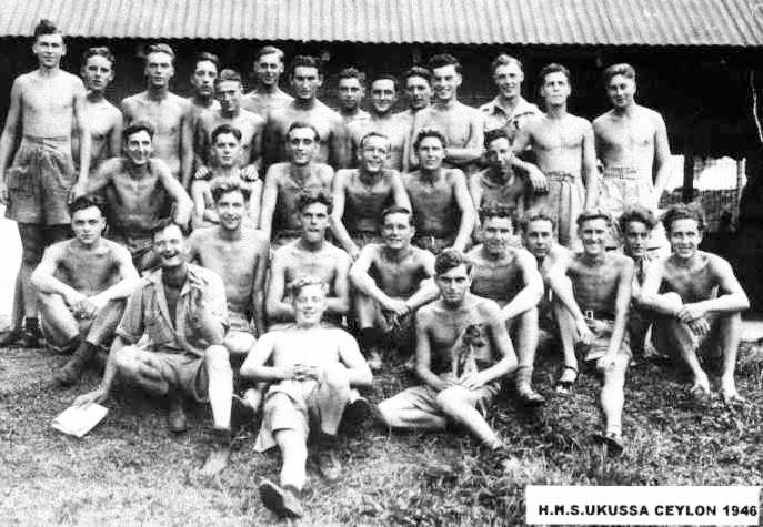 No. 9 Squad group photo of No. 1850 Squadron at HMS. Ukussa, Katukurunda, Ceylon between April and June 1946. Dad is in 1st Row Standing, 4th. left to right (hands on shoulders of man in front). Back Row (l to r) ?, ?, ?, ?, ?. 1st Row Standing (l to r) ?, ?, L. Pratt, R. Davis, ?, H. Hoskins, P. Jackson, ?, ?. Seated on bench (l to r) ?, ?*, E. Packer*, ?*, ?, ?. Seated on Ground 2nd Row (l to r) ?, ?, ?, ?, ?, A. Garwood, ?, M. Mytton, 'Chopper' Barnes. Seated on Ground 1st Row (l to r) 'Pop' Ellison, ?, E. Miles & Dog 'Peggy'. (* Searching for).