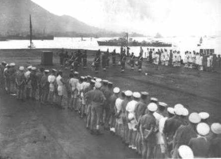The Royal Marines beating the retreat on the flight deck of HMS. Vengeance in Hong Kong, 1945.