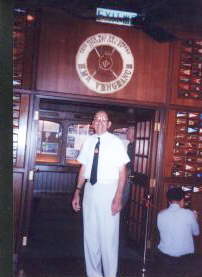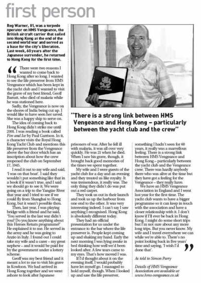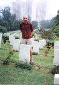 Left: Reg Warner below the life preserver from HMS. Vengeance displayed in the The Royal Hong Kong Yacht Club lounge. Right: Reg visits the war grave of his ship mate Geoffrey Barrett, who died of Malaria in Hong Kong on 7th October 1945.